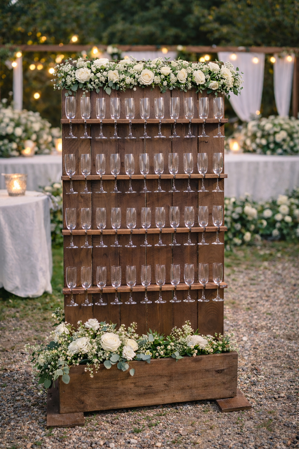 Offrez à votre réception une touche élégante et conviviale avec ce mur à champagne en bois, idéal pour accueillir vos invités avec style. Véritable élément décoratif et fonctionnel, ce présentoir à flûtes crée un effet visuel spectaculaire tout en facilitant le service lors de votre vin d’honneur, cocktail ou réception de mariage.