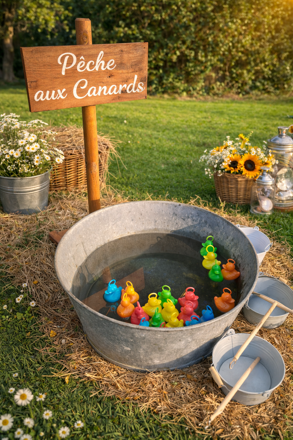 Fourni avec les canards, les cannes à pêche, les seaux et  le panneau en bois.