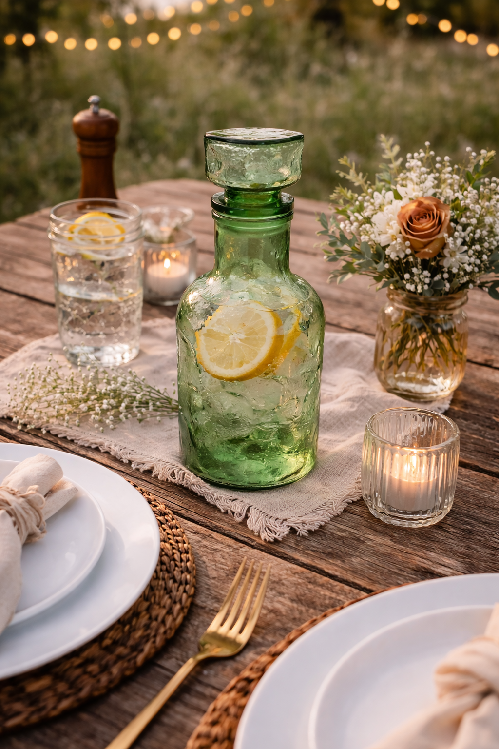 Apportez une touche rétro et authentique à vos tables avec cette bouteille en verre vert des années 70. Parfaite pour servir eau, vin ou toute boisson, elle combine style vintage et fonctionnalité pour vos événements.