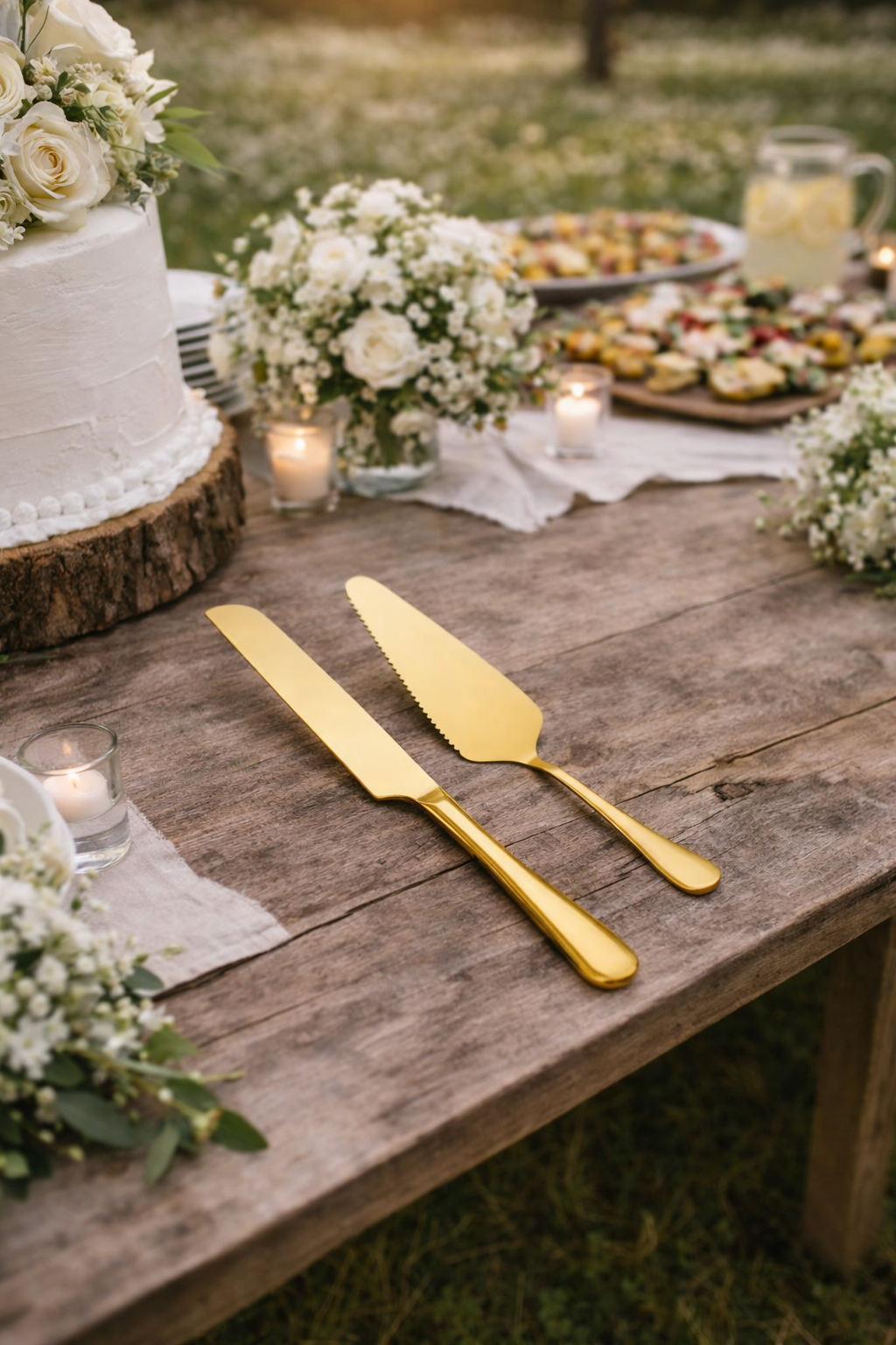 Un ensemble de couverts à gâteau doré élégant et raffiné, idéal pour la découpe et le service de vos gâteaux lors de mariages, anniversaires, baptêmes ou réceptions.
