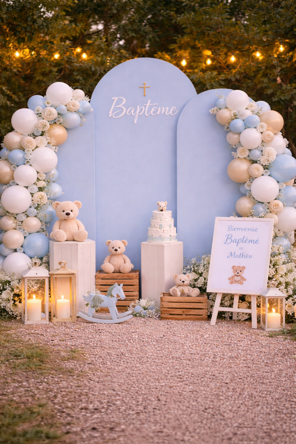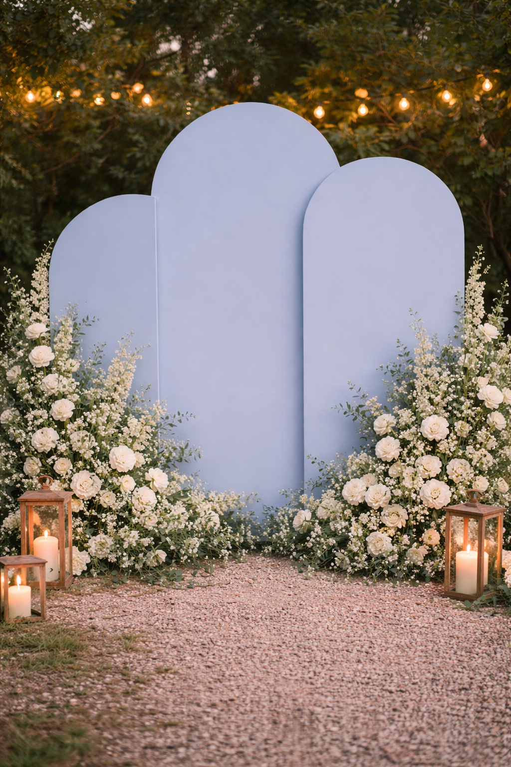 Son design minimaliste et épuré apporte une touche chic et contemporaine, parfaite pour créer un espace photo, un décor de cérémonie ou un coin accueil invités. Installé en extérieur sur un sol gravillonné et accompagné de lanternes lumineuses, ce fond décoratif instaure une atmosphère chaleureuse et raffinée qui met en valeur chaque événement.